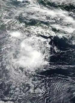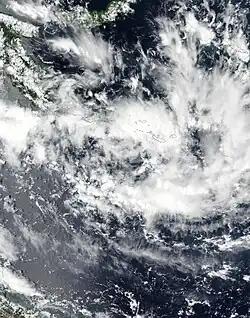 By 4 February, the BoM noted that a weak tropical low may form within the vicinity of Christmas Island, and predesignated it as 17U.[87] The low then subsequently formed by the next day, about 300 km (190 mi) west-southwest of Christmas Island.[88] By 7 February, the JTWC started to monitor 17U, and gave it a medium chance for development within the next 24 hours.[89] The BoM subsequently gave the system a low chance for development in the next 3 days.[90] Under an environment of warm sea surface temperatures, lowering vertical wind shear and fair poleward outflow, the low started to organize, with deep convection wrapping to its low-level circulation center, prompting the JTWC to issue a TCFA by the next day.[91] However, as it moved south-southwest,[92] the wind shear started to increase, leading to its LLCC becoming exposed and the JTWC cancelling the TCFA on 10 February.[93] 17U continued westwards, and was last noted by the BoM on 13 February, before exiting the basin shortly thereafter.[94]