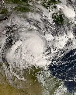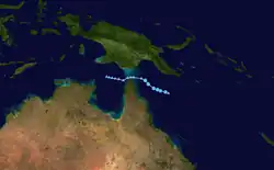 On 4 January, the BoM started to monitor a possible tropical low near the Coral Sea.[59] By 8 January, BoM began issuing advisories on Tropical Low 10U.[5][60] The JTWC later issued a TCFA on the system.[61] By the next day, the BoM upgraded it to a category 1 tropical cyclone, and named it Tiffany.[5] The JTWC subsequently followed suit and started issuing advisories on Tiffany.[62] Tiffany then rapidly intensified, peaking as a Category 2 tropical cyclone in the Australian scale and a Category 1-equivalent tropical cyclone in the Saffir-Simpson scale.[5][63] The storm then rapidly weakened and made landfall over the Cape York Peninsula as a category 1 tropical cyclone at 06:00 UTC on 10 January. Due to land interaction, it rapidly weakened overland and became a weak tropical low. The low entered into the Gulf of Carpentaria with that intensity by the same night.[5] Despite the moderate wind shear, Tiffany re-intensified, with the BoM upgrading the system into a category 2 tropical cyclone by 11 January.[64][5] On 00:00 UTC of 12 January, the storm made its final landfall over the Northern Territory region and was followed by rapid weakening.[5] The JTWC stopped issuing advisories by the same time.[65]