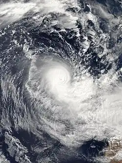 At this time, it started to incline more southwards under the influence of an upper trough moving to the east and a subtropical ridge to its south strengthening, with its pressure bottoming to 997 mbar (29.44 inHg). Paddy also reached its eventual peak intensity, with maximum 10-minute sustained winds of 40 kn (75 km/h; 45 mph), according to scatterometer passes.[1] Sea surface temperatures around 28 °C (82 °F), low wind shear and favorable upper-level divergence were the factors behind Paddy's intensification.[21] Paddy then reacted quickly to increasing northwesterly shear, as its convection began to decrease at 12:00 UTC that same day,[22] and by early next day, the BoM reported that Paddy had become an ex-tropical cyclone. As it turned to the south-southwest as the ridge to its south strengthened further, the synoptic gradient between the two increased, letting the storm reintensify slightly that same day, though gale-force winds were not wrapping halfway of the system. The winds would later rapidly decrease, and by 24 November, the BoM discontinued monitoring Paddy.[1] The JTWC subsequently followed suit and issued its final warning on the storm.[23]