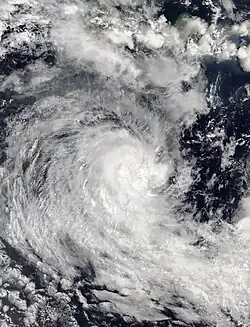 On 6 December, the BoM predicted that a tropical low could form near the Solomon Sea.[36] Two days later, the tropical low formed, resulting in the BoM designating it as 07U,[37][3] while the JTWC issued a TCFA on the system.[38] The system's deep convection became more organized overnight on 10 December, and began to strengthen, with gale-force winds being reported on 11 December.[3] Late on the same day, the JTWC upgraded the system into a tropical storm.[39] By the next day, it was upgraded to a Category 1 tropical cyclone on the Australian scale, resulting in the BoM naming it Ruby. Twelve hours later, the BoM would upgrade Ruby into a Category 2 cyclone,[3] while the JTWC upgraded the system into a category 1-equivalent tropical cyclone.[40] By 13 December, Ruby reached its peak intensity,[3] before entering the South Pacific basin.[41]