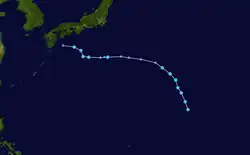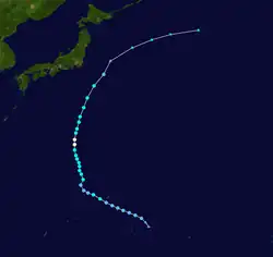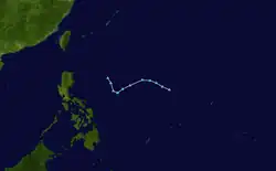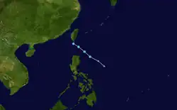 On May 27, the JMA and the JTWC noted the persistence of an area of atmospheric convection about 425 nautical miles (787 km; 489 mi) south-southeast of Guam.[57] The area's nearby environment exhibited low wind shear and warm sea surface temperatures, which were ideal conditions for tropical cyclogenesis.[58] The JMA assessed the area to have developed into a tropical depression on May 29 at 06:00 UTC.[59] The PAGASA made a similar assessment in a Tropical Cyclone Advisory issued at 15:00 UTC.[60] The JTWC later followed with their own assessment, identifying the center of the newly developed tropical depression and assigning the designation 04W.[61] As the system tracked westward, it entered the Philippine Area of Responsibility at 01:00 PHT (17:00 UTC).[62] The PAGASA then named the storm Dante in its first Tropical Cyclone Bulletin for the storm.[63] Dante further organized in the Philippine Sea,[64] and on May 30 at 15:00 UTC, the JTWC upgraded it to a tropical storm,[65] with the PAGASA doing the same at 21:00 UTC.[66] On the next day at 00:00 UTC, the JMA also upgraded Dante into a tropical storm, giving it the international name Choi-wan.[67] Choi-wan's center was exposed due to a tropical upper tropospheric trough from the northeast, inducing shear on the system.[68] On June 1 at 12:30 UTC, Choi-wan made landfall on Sulat, Eastern Samar as a minimal tropical storm,[69] with the JTWC downgrading it to a tropical depression at 15:00 UTC.[70] It made a second landfall on Cataingan at 17:00 UTC.[71] Choi-wan made several more landfalls on the Philippines, making its third landfall on Balud, Masbate at 19:30 UTC. It made a fourth landfall on Romblon, Romblon on June 2 at 00:00 UTC, a fifth on San Agustin, Romblon at 00:50 UTC, a sixth on Pola, Oriental Mindoro at 06:00 UTC, a seventh on Tingloy, Batangas at 11:20 UTC, and an eighth and final landfall on the Calatagan Peninsula before moving into the South China Sea.[72] On June 3 at 03:00 UTC, the JTWC upgraded Choi-wan back to a tropical storm.[73] At 03:00 UTC, the PAGASA removed all Tropical Cyclone Warning Signals as Choi-wan moved away from the country.[74] Choi-wan then exited the PAR on June 3 at 18:00 UTC[75] before weakening into a tropical depression on the next day at 06:00 UTC and re-entering the PAR at 08:00 UTC.[76] Then, it passed southeast of the island of Taiwan[77] before moving out near the Okinawa Prefecture and heading towards Japan. On June 5 at 06:00 UTC, the Japan Meteorological Agency issued their final advisory on the system.[78] 3 hours later at 09:00 UTC, the JTWC upgraded Choi-wan back into a tropical storm,[79] however at 15:00 UTC, the Joint Typhoon Warning Center downgraded the system to a tropical depression, also issuing their final advisory on the system.[80]