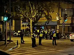 After two days of protests in Shanghai, police erected barricades in Ürümqi Middle Road on 28 November.[85] Later that evening, police were out checking the phones of pedestrians in Shanghai,[83] in which they were specifically instructed to look for VPNs, Telegram, and Twitter.[86]
