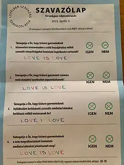 - ^ Wakefield, Lily (12 January 2022). "Desperate Viktor Orbán sets horrific anti-LGBT+ referendum for same day as Hungary election". PinkNews. Retrieved 25 January 2022.