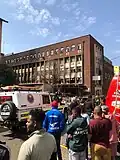 President Cyril Ramaphosa visited the site of the tragedy on 31 August, calling it a "wake-up call".[16] Gauteng Premier Panyaza Lesufi announced an inquiry into the fire.[19] While government officials blamed the crisis on NGOs, who prevented the previous attempts to evict occupiers from similar properties,[20][21][22] NGOs and inner city property owners argued that it was the duty of the City of Johannesburg to maintain buildings, provide services and enforce safety regulations.[23] South Africa's courts have consistently ruled that evictions cannot proceed unless alternative housing is provided under the provisions of the 1998 Prevention of Illegal Eviction Act.[24][25] Following the fire, the City attempted to disconnect illegal electricity connections from similar hijacked buildings in the city, but was met with strong resistance from residents.[26]