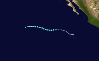 On August 18, the NHC began observation of a system well to the south of the coast of Mexico with potential for some slow development.[78] Four days later, on August 22, a broad area of low pressure producing disorganized showers and thunderstorms primarily west of its center formed far south of the southern tip of the Baja California peninsula.[79] By the afternoon of August 25, the tropical disturbance had developed a well-defined surface circulation with 45 mph (75 km/h) maximum sustained winds, and was upgraded to Tropical Storm Hector.[80] Northerly wind shear and passage over cool SSTs, left in the wake of Hurricane Gilma, prevented Hector from strengthening much.[81] Hector strengthened slightly on August 26 and reached its peak intensity, with maximum sustained winds of 60 mph (95 km/h) and minimum central pressure of 998 mbar (29.5 inHg).[82] Continued unfavorable environmental conditions caused Hector to gradually become less organized thereafter, with moderate wind shear exposing Hector's low-level circulation center.[83][84] Hector continued to weaken, and the storm opened into a trough early on August 29.[85]