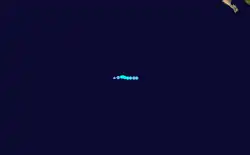 On August 15, the NHC noted that a low-pressure area could form far southeast of the Hawaiian Islands.[64] Two days later, as the disturbance formed, the NHC noted that another low-pressure area could develop in the vicinity of the first disturbance.[65] By August 20, both disturbances had formed and merged into a larger area of shower and thunderstorm activity.[66] The merged disturbance steadily developed,[67] and on August 22, organized into Tropical Depression One-C.[68] Six hours later, after further intensification, the CPHC upgraded One-C to Tropical Storm Hone.[69] Hone gradually strengthened through August 23 and 24. Despite lacking much deep convection, Hone had a well-defined cloud field, and was moving over moderately warm waters.[70] Hone developed more deep convection and convective banding as it intensified. The storm moved just north of due west under the influence of a subtropical ridge to its north.[71] Continuing on this trajectory, at 08:00 UTC on August 25, Hone strengthened into a Category 1 hurricane. Around this time, the system passed about 60 mi (95 km) south of Ka Lae, the southernmost point of the Big Island of Hawaii.[72] But by the following day, drier air and increased wind shear had caused Hone to weaken back to a tropical storm.[73] Gradually losing deep convection and organization, Hone continued to weaken over open waters.[74] Early on August 30, Hone weakened to a tropical depression,[75] before undergoing a persistent burst of convection which made the system a tropical storm again early the following day.[76] Hone and the low eventually merged, resulting in the system's extratropical transition on September 1.[77]