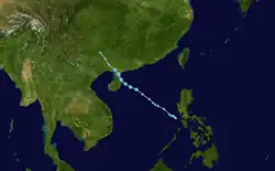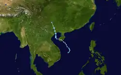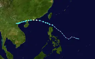 On June 24, the JMA reported the development of another tropical depression east of the Philippines. The JTWC later designated it as 03W on the following day. The storm moved toward southern China, making landfall along the eastern coast of the Leizhou Peninsula and dissipating inland on June 26.[6] It caused 18 fatalities in Northern Vietnam and resulted in minimal damage.
