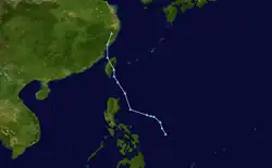On June 11, the JMA announced that a tropical depression had developed east of the Philippines.[23] On the same day, PAGASA started monitoring the disturbance as a low-pressure area while it was still inside the Philippine Area of Responsibility (PAR).[24] By the following day, it had intensified into a tropical depression and was named Auring by the PAGASA.[25] The PAGASA reported that Auring made landfall in Taiwan and later weakened into a remnant low due to the frictional effects of its landfall.[26][27] The agency issued its final advisory when the system exited the PAR,[28] while the JMA continued to monitor it until it was last noted on June 13.[29] The system was not tracked by the JTWC.