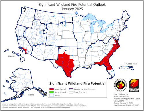 In March 2025, the Climate Prediction Center (CPC), a branch of NOAA, issued its National Seasonal Fire Outlook. This forecast projected above-normal wildfire risk for much of California, Oregon, Washington, Nevada, and the southwestern United States. The elevated risk was linked primarily to persistent atmospheric patterns resembling La Niña, which typically reduce precipitation and increase temperatures in these regions. The outlook considered factors such as expected temperature and precipitation anomalies, soil moisture, and vegetation dryness to predict fire activity for the upcoming season.[3]