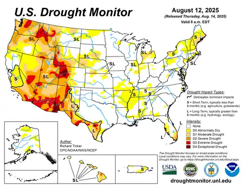 By mid-2025, the U.S. Drought Monitor reported that nearly 45% of the western United States was under severe to exceptional drought conditions, with California and Nevada among the hardest-hit states. These drought conditions stressed vegetation and depleted soil moisture, significantly reducing fuel moisture content and thereby increasing wildfire risk and severity across large areas.[5]