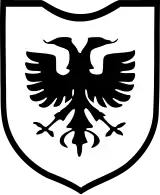 The division's identification symbol, used on its vehicles, was a black Albanian double-headed eagle.[1][3][2] Despite its short existence, a collar patch depicting the goat-crested helmet of Skanderbeg was designed and manufactured for the division, but it was withdrawn from service after a trial as it was unrecognisable from a distance. As a result, officers of the division wore the collar patch with the SS runes, and enlisted ranks wore a plain black collar patch.[91] Photographs exist of a machine-woven cuff band with the title Skanderbeg,[40] but this was awarded to the 14th SS Volunteer Gebirgsjäger Regiment of the 7th SS Division in the latter part of 1944, and not to this division.[92] Albanian members of the division wore an arm shield on their upper left arm depicting a black Albanian double-headed eagle on a red shield with black backing.[93][94] Many of the division's Muslim members wore traditional grey-coloured skull caps with the SS eagle and death's head on the front instead of the standard SS field cap.[3] Others wore the traditional Albanian highlander hat, the qeleshe.[59]