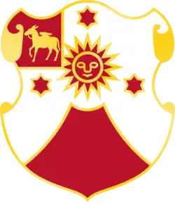 - Shield- Parti per chevron couped and concave Argent and Gules in chief a sun between three six pointed mullets one and two all of the second, on a canton of the like a mule with mountain artillery pack Or (for the Second Field Artillery).