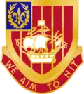 The shield is red for Artillery. The six pallets couped produce a diminished bordure effect on the shield and represent the six batteries comprising the Regiment at the time of its organization. The ship is a representation of the ship of Don Juan Rodrigues Cabrillo, a Portuguese, who discovered San Diego Harbor. The charges on the canton, the fleur-de-lis encircled by a garland of laurel, are taken from the coat of arms of the 250th Coast Artillery, as Batter B of the 251st Coast Artillery, California National Guard, is a descendant of Batter F of the 250th Coast Artillery, California National Guard which served during World War I as B Battery of the 65th Coast Artillery (US).