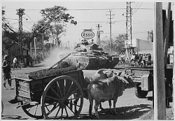 Tank from 1st Battalion, 69th Armor, 25th Infantry Division, moves through Saigon shortly after disembarking from LST at Saigon Harbor, 12 March 1966