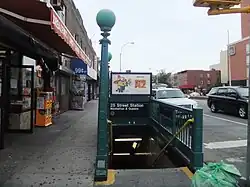 The 25th Street station is a local station on the BMT Fourth Avenue Line of the New York City Subway. Located at the intersection of 25th Street and Fourth Avenue in Greenwood Heights, Brooklyn, it is served by the R train at all times. The D and N trains also stop here during late nights, and some rush-hour W trains stop here in the peak direction.