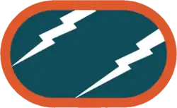 The 313th's flash is a teal blue shield-shaped embroidered item with a semi-circular base. Around the edge of the flash is a 1⁄8 inch (0.32 cm) orange border, two white lightning bolts bendwise sinister, one issuing from the top of the flash and one issuing from the lower right side; the overall dimensions are 2+1⁄4 inches (5.7 cm) in height by 1+7⁄8 inches (4.8 cm) in width. The airborne background trimming is a teal blue oval-shaped embroidered item edged with a 1⁄8 inch (0.32 cm) orange border two white lightning bolts bendwise sinister, one issuing from the top of the item and one issuing from the right side. The overall dimensions are 1+3⁄8 inches (3.5 cm) in height by 2+1⁄4 inches (5.7 cm) width.[31]