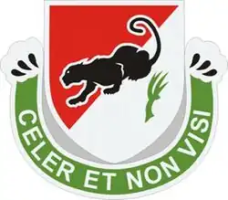 - Description: A Silver color metal and enamel device 1+1⁄8 inches (2.9 cm) in height overall consisting of a shield blazoned: Per bend sinister Gules and Argent, a crouching panther, tail elevated, Sable; to sinister a shrub Vert. Attached below a green motto scroll with the ends forming cat paws armed Sable, inscribed "CELER ET NON VISI" in Silver letters.