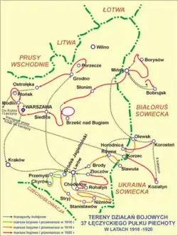 The regiment commemorated the Rohatyn battle, its first in the Polish–Soviet War where all battalions fought together, by designating September 9 as its regimental holiday.[16] Over the following days, it continued defending Rohatyn from Soviet counterattacks. Reinforced with three marching companies on September 13, the regiment, as part of the 4th Infantry Division, pursued the enemy to Vyshnivets.[15] On September 25, it was transported to Grodno as a reserve unit for the high command. Redirected by the 2nd Legion Infantry Division, the regiment moved via Grodno and Łomża to Ostrołęka on 12 November 1920. It served in border protection there until 28 April 1921, after which it returned to Kutno and Łęczyca.[15]