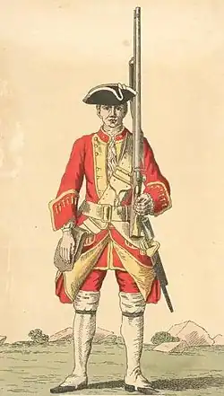The regiment fought at the Battle of Minden in August 1759 during the Seven Years' War.[9] After the battle the men of the regiment picked dog-roses from the hedges and put them in their headdresses to celebrate the victory.[10] It also took part in a skirmish at Grebenstein in June 1762[11] and another at Fellinghausen in July 1762.[11] It was then garrisoned in Menorca from 1763 to 1769.[12]