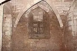 The undercroft consists of two square bays making a rectangular room (just over 21 by 11 feet (6.4 by 3.4 m)).[3] There are two separate entrances, one by which the cellar is entered from Herbert Art Gallery and Museum in the west and another, which is blocked after a few steps, in the east.[3] There are niches in the western and southern walls which were used to store valuable goods.[2]