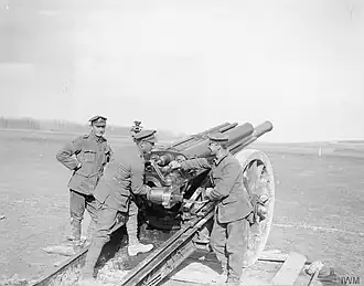 There was little activity during January and February 1918, 38th (W) Hvy Bty occasionally firing to disperse enemy working parties or for CB shoots, otherwise to check lines and calibrate its guns. The men spent much of the time building alternative and rear gun positions in case of an enemy offensive. A thaw set in in mid-January, and the battery's badly designed dugouts were flooded, creating more discomfort and work for the men. On 25 January the Germans carried out a shoot on Feuchy with gas and HE, the first rounds landing on the battery's lead section, causing a number of gas casualties and destroying many cartridges. Similar shoots later in the month caused no damage to the battery. 63rd Brigade moved from Athies to Tilloy Wood in February, and 38th (W) Hvy Bty took over the guns and positions of 1/1st Lowland (City of Edinburgh) Hvy Bty. The battery's personnel spent 10–16 February at XVII Corps' rest camp.[18][45]