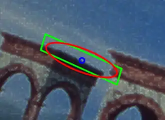 An example of a detected feature in an image. Blue indicates the center of the feature, the red ellipse indicates the characteristic scale identified by the feature detector, and the green parallelogram is constructed from the coordinates of the ellipse as per [Lowe 2004].