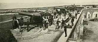 The 3rd Rhode Island Heavy Artillery Regiment was initially organized in Providence, Rhode Island as the 3rd Rhode Island Infantry Regiment in August 1861. It was officially changed to heavy artillery on December 19, 1861 at Hilton Head, South Carolina.[1] It consisted of 12 batteries designated 'A' through to 'M'.[2] The regiment was the largest unit fielded by Rhode Island during the war, with more than 2,000 men serving in it during the period of its existence, drawing its recruits from the settlements of Providence, Warwick and Pawtucket. It served in a variety of roles, including as both light and heavy artillery, engineers, infantry and cavalry, as well as manning US Navy gunboats. The regiment fought in battles in Virginia, South Carolina, Georgia and Florida.[3] The 3rd Rhode Island Heavy Artillery's term of service ended on August 27, 1865.[4]