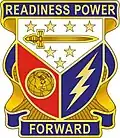 The Distinctive Unit Insignia is a round bottom shield divided into thirds white, red and blue. The white top section contains a gold sword and 7 gold stars. The blue section a gold lightning bolt and the red section a gold globe. Above and below is a blue ribbon containing the motto "Readiness Power Forward."[2]