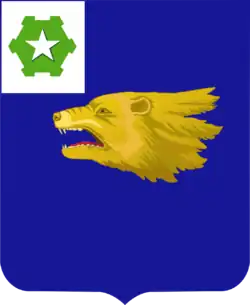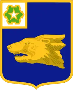 • Shield: Azure, the head of a wolverine erased Or; on a canton Argent a six-bastioned fort Vert charged with a mullet of the third (for the 36th Infantry).