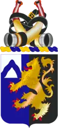• Shield- The colors blue and white are used for Infantry. Black and gold are the colors of the Belgian coat of arms from which the Belgian lion is adapted. The wavy chevron on the canton is for descent from the 9th Infantry. The Belgian lion represents the organization's action at Ardennes and St. Vith, for which it was awarded two unit decorations by the Belgian government.