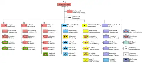 The division was reorganized as a heavy division in 1985 under the Army of Excellence structure together with the 50th Armored and the 35th and 40th Infantry Divisions. Thus, the division included four mechanized and six armor battalions by 1989. Due to equipment security concerns, the Army Reserve 549th Military Intelligence Battalion fulfilled the electronic warfare and intelligence role for the division, as in all but one of the National Guard divisions.[14] On 1 June 1988 the division ceded some of its units, including the 1st Battalion, 133rd Field Artillery to the 36th Brigade, 50th Armored Division, which had been activated on that day.[9][15][16][17] 3rd Battalion, 132nd Field Artillery was reactivated at El Paso to replace the 1st Battalion, 133rd Field Artillery.[18]