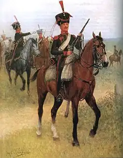 It was formed in 1806[1] together with the 14th Cuirassier regiment and the 15th Lancer regiment, it formed the left brigade commanded by General Benedykt Łączyński. After the end of combat operations, according to the order of 10 August 1807, the 4th regiment of mounted riflemen under Colonel Mięczyński garrisoned in Warta.[2]