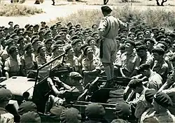 The 4th Parachute Brigade was formed at RAF Kibrit in the Middle East on 1 December 1942.[7] Upon formation it consisted of the brigade headquarters, signals company, defence platoon and three parachute battalions.[8] The battalions assigned were the 156th Parachute Battalion (156 Para), raised from British servicemen in India, the 10th Parachute Battalion (10 Para), formed around a cadre from the 2nd Battalion, Royal Sussex Regiment, and the 11th Parachute Battalion (11 Para), created from a cadre of 156 Para.[9] The brigade's battalions all had the same composition: three rifle companies, each comprising a company headquarters, and three platoons. Each had a Support Company of mortar, machine gun and carrier platoons, along with a Headquarters Company.[10] The brigade's first commander, Lieutenant-Colonel Kenneth Smyth, was replaced by Brigadier John Hackett on 4 January 1943.[11]