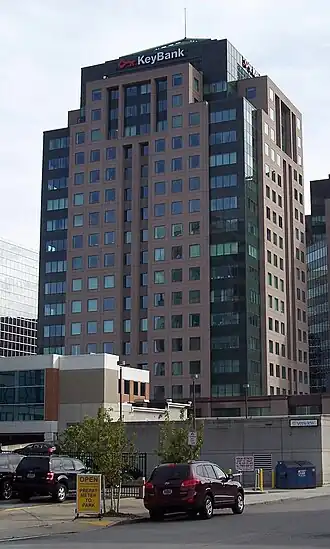 50 Fountain Plaza, formerly the Key Center North Tower, is a high-rise located in Buffalo, New York, USA. It is the eighth tallest building in Buffalo at 275 feet (85 m) and 17 stories tall.[1] The building has a twin tower next door, 40 Fountain Plaza (formerly Key Center South Tower) which is four stories shorter and connected by a two-story glass atrium encompassing 18,800 square feet of retail space. Once known as the Key Center, the complex is now simply known as Fountain Plaza after KeyBank moved out.[2][3] Both buildings have distinctive pyramid tops that are trimmed with LED lighting strips which are illuminated at night and can change color for specific occasions or holidays.[4] In the front of the two towers is a large fountain in the summer. In the winter, it serves as an outdoor ice rink that is free to the public.[5]