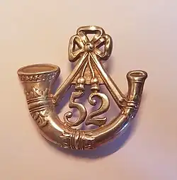 The Regimental Badge of the 52nd showed a bugle horn, suspended by cords from a knot, with the number "52" below the tassels. The bugle horn had been the badge of light infantry regiments since 1770, adapted from the Hanoverian Jaegar regiments, and became standard for the newly formed Light Infantry regiments, since it represented the bugle calls used for skirmishing orders instead of the standard line infantry drum.[23] The regimental badge was worn on much of the equipment, including the shakos and belts, and also frequently on turnbacks and officers' shoulder wings.[99][100]