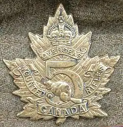 The 5th Battalion Canadian Mounted Rifles were a mounted infantry unit of the Canadian Expeditionary Force (CEF) during World War I. The unit was raised from volunteers of the 7th and 11th (Canadian) Hussars from the Eastern Townships of Quebec.[1][2]