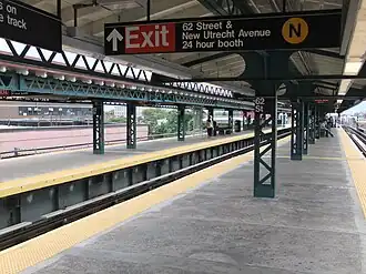 The 62nd Street station is an express station on the BMT West End Line that has three tracks and two island platforms. Effective June 2025, the middle express track is used by one southbound R train and two southbound W trains during the morning rush hour.[26][27] The next station to the north is 20th Avenue, while the next station to the south is 25th Avenue.
