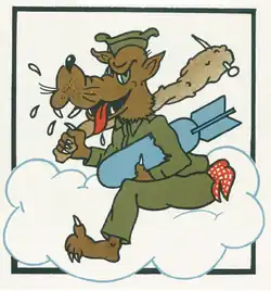 - ^ Approved 24 July 1943. Description: On a white rectangle, long axis vertical, border black, a caricatured brown wolf in khaki work uniform, astride a large white cloud formation in base, edged light blue, carrying a large knotty club tan with spike through end, in right hand, and carrying a blue aerial bomb under the left forepaw; red polka dot handkerchief in hip pocket.