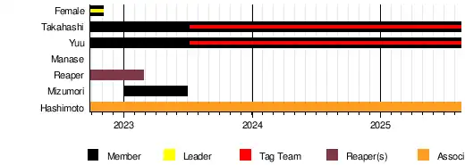At Stardom Sunshine 2023 on June 25, Takahashi defeated Hanako in another passion injection bout.[19] At Stardom Mid Summer Champions 2023 on July 8, Yuna Mizumori teamed up with Waka Tsukiyama to defeat Queen's Quest (Miyu Amasaki and Hina), and Nanae Takahashi defeated Starlight Kid in another passion injection bout. Mizumori silently defected the unit to join Cosmic Angels in the process.[20] Since then, the stable officially reduced to the tag team of Nanae Takahashi and Yuu. At Stardom Midsummer Festival on August 19, 2023, Takahashi teamed up with her old "NanaMomo" tag team partner Momoe Nakanishi and Jaguar Yokota to defeat Black Desire (Momo Watanabe, Starlight Kid) and 7Upp teammate Yuu in six-woman tag team action.[21]