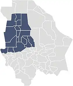 Under the 2023 districting plan adopted by the National Electoral Institute (INE), which is to be used for the 2024, 2027 and 2030 federal elections,[11] the district is located in the centre-west portion of the state, and comprises 509 electoral precincts (secciones electorales) across 19 municipalities:[12][13]