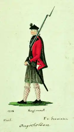 - ^ While it wore the Scottish Highland uniform and was known as a Highland Regiment, it consisted of no more than 25% Scottish membership, the rest made up of the other nationalities present in the English Colonies during the American Revolution.
