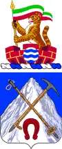 - Shield: Azure, on a mountain issuant from base Argent, an ice axe, and ski pole in saltirewise, points to base Proper, a horseshoe, points to base Gules.