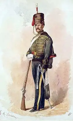 The future Field Marshal Sir John French, who prided himself on his Irish ancestry despite his family having lived in England since the eighteenth century, was commissioned as a lieutenant in the 8th King's Royal Irish Hussars in February 1874, but there is no evidence that he ever served with them. He transferred to the 19th Hussars in March 1874[13] possibly as he was better able to afford the £500–£600 per annum required by his new regiment. His biographer Richard Holmes wrote that the 8th King's Royal Irish Hussars at this time had a reputation as an expensive regiment for junior officers, who sometimes drank claret for breakfast.[14]