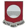 A silver color metal and enamel device 1 1/8 inches (2.86 cm) in height overall consisting of a shield blazoned: Gules, a plate charged throughout with a masoned stone arched bridge Proper. Attached below the shield is a scroll inscribed "ACTS NOT WORDS" in black letters.