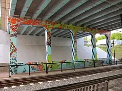 Nearby, along the rail trail, is Halcyon Idyll I and Halcyon Idyll II, by Sharon Dowell. These murals cover approximately 9,000 sq ft (840 m2) on five facades facing the sidewalk, located under 11th Street and Brookshire Freeway. Adjacent to the underpass murals is a signal house wrapped in vinyl with a vibrant pattern titled Coexist.[2]