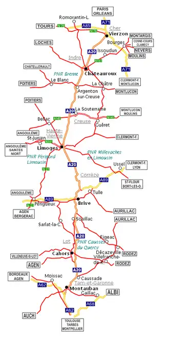 The A20 autoroute or L'Occitane is a highway through central France. A part of France's national network of autoroutes, it is 427 kilometres (265 mi) long.