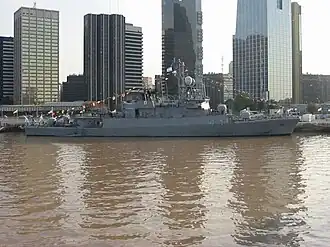 Parker had been planned for conversion to the offshore patrol role at the Tandanor shipyard.[3] For that role, a hydraulic crane was installed to permit the deployment of 5.5-metre (18 ft) semi-rigid fast boats while space, previously used for the storage of MM38 Exocet missiles, was converted into extra personnel accommodation space. The work had been scheduled for completion by the end of 2023.[7] However, the work was reported to be in limbo as of late 2024.[8][9]