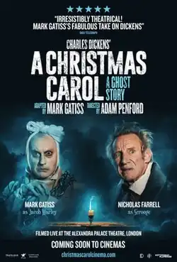 The production was originally scheduled to open in 2020 but was delayed due to the COVID-19 pandemic.[3] It was eventually produced at the Nottingham Playhouse from 29 October to 20 November 2021 before transferring to the Alexandra Palace in London where it ran from 26 November 2021 to 9 January 2022 with a cast of 15 playing 50 characters, including Nicholas Farrell as Scrooge and Gatiss as Marley. The production was filmed live for a cinema release during the run in London and received a cinema release on 27 November and 1 December 2022 [4][3][5] before it was shown on BBC Four on 25 December 2022.[6]