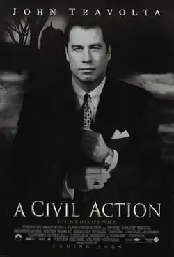 A Civil Action is a 1998 American legal drama film written and directed by Steven Zaillian, based on the 1995 nonfiction book of the same name by Jonathan Harr. The film stars John Travolta as personal injury attorney Jan Schlichtmann, with supporting performances from Robert Duvall, James Gandolfini, Dan Hedaya, John Lithgow, William H. Macy, Kathleen Quinlan, and Tony Shalhoub. The narrative dramatizes the true story of a landmark environmental lawsuit in Woburn, Massachusetts, during the 1980s, in which residents alleged that industrial contamination of the local water supply—specifically with the chemical trichloroethylene—had thought to have led to multiple cases of leukemia and other serious health issues. The case, formally titled Anne Anderson, et al. v. Cryovac, Inc., et al., became one of the most high-profile toxic tort lawsuits of its time.