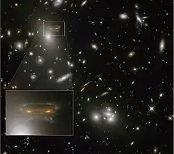 Abell 68 has a strong gravitational lens. It was able to detect objects at a much further distance with the lens.[12] According to observations by Hubble Space Telescope, the gravitational lens was able to capture a background galaxy, called ERO J003707.[13] Located at redshift 1.6, the lens somehow twisted the galaxy into a form of a 1970s video game alien from Space Invaders.[14] Furthermore ERO J003707, is an L* early-type disk galaxy with similar properties (R-K)>=5.3 and K<=21 shared by ~10 percent of galaxies. Looking at its evolution stage, researchers theorized; the cooling of the gas presented by hierarchical galaxy formation models could develop EROJ003707 into a luminous spiral galaxy.[13]